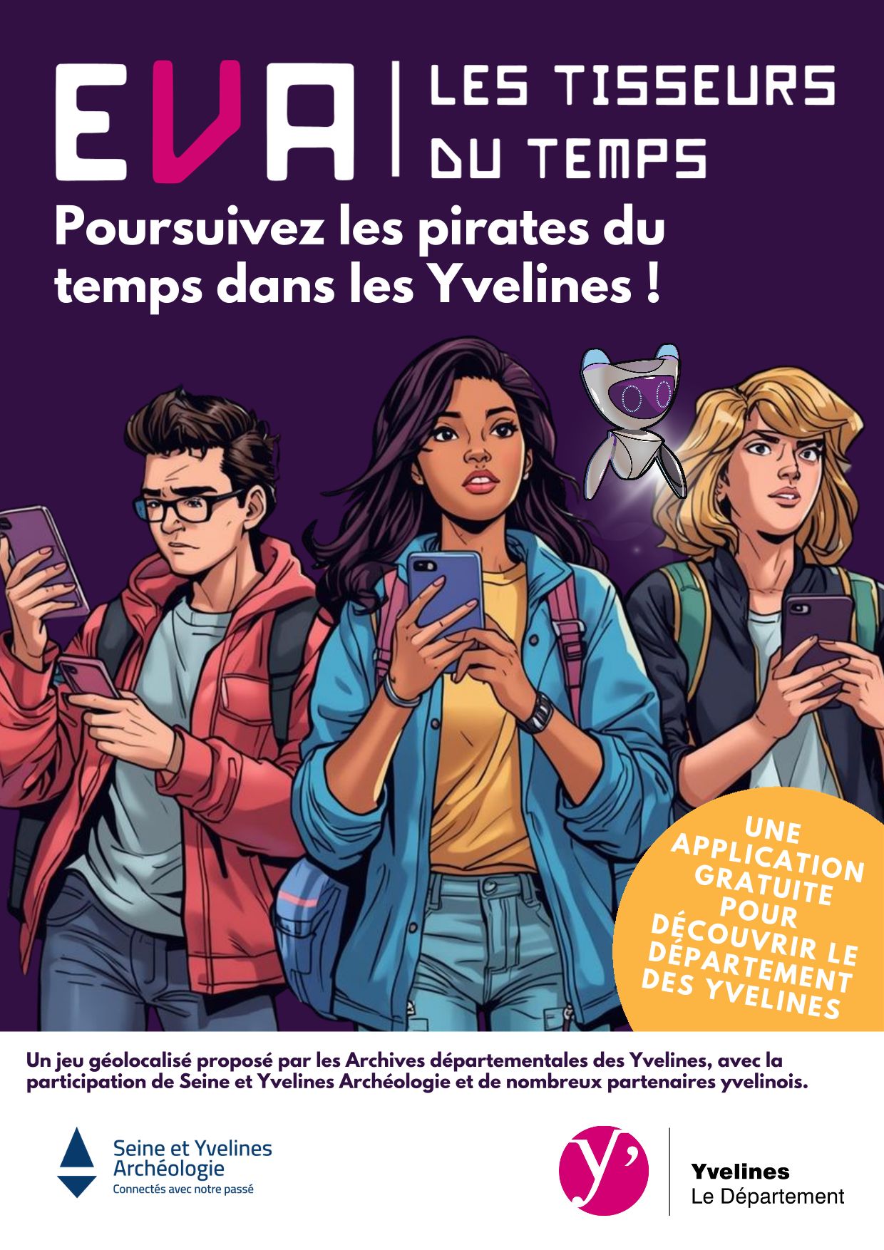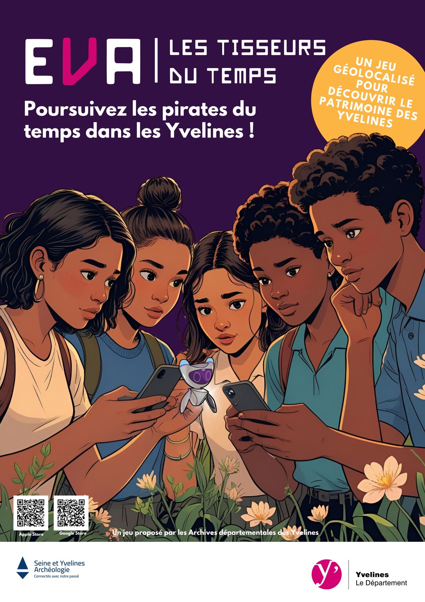 Téléchargez l'application sur Google Store et Apple Store en saisissant "EVA Tisseurs du temps" et commencez à résoudre les premières énigmes sur le territoire !