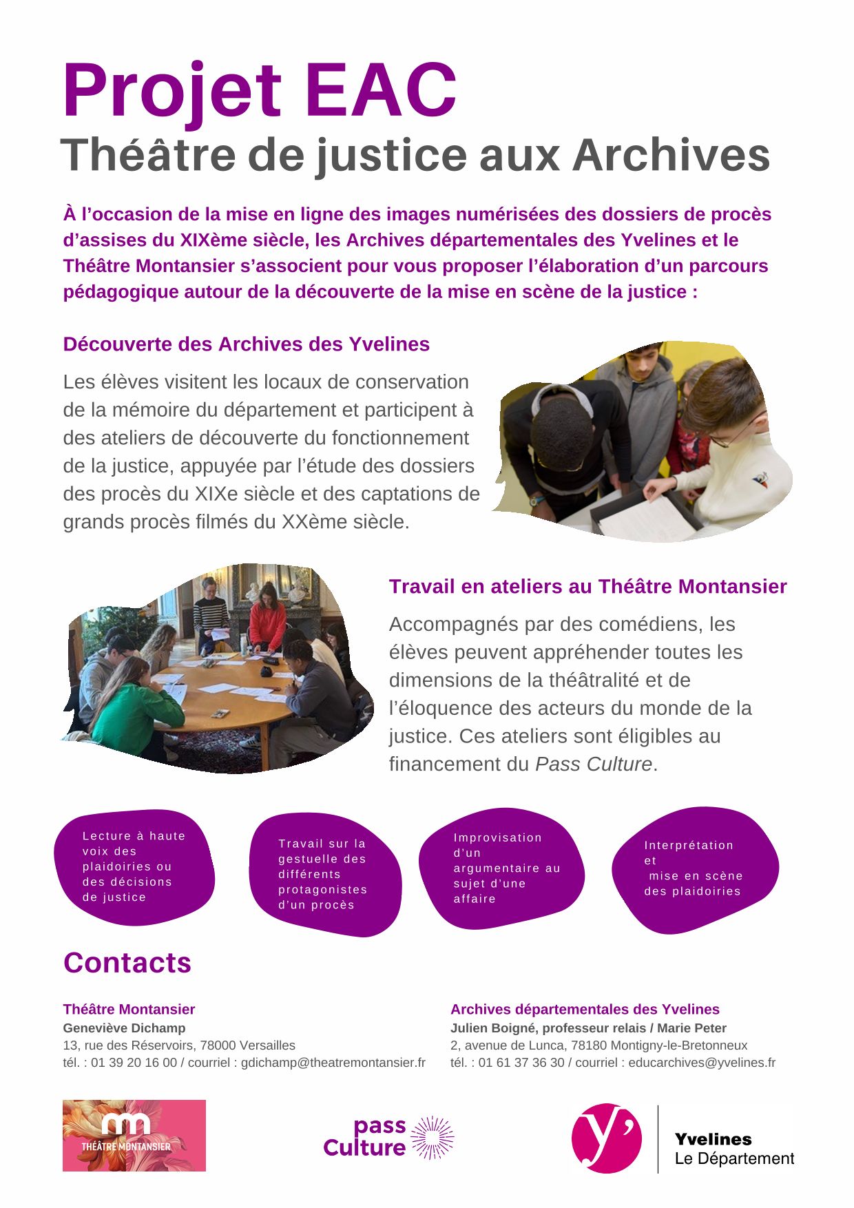 Ce projet est porté en partenariat avec le théâtre Montansier de Versailles. Son équipe de comédiens formera les élèves à toutes les dimensions de la théâtralité et de l'éloquence des acteurs du monde de la justice.