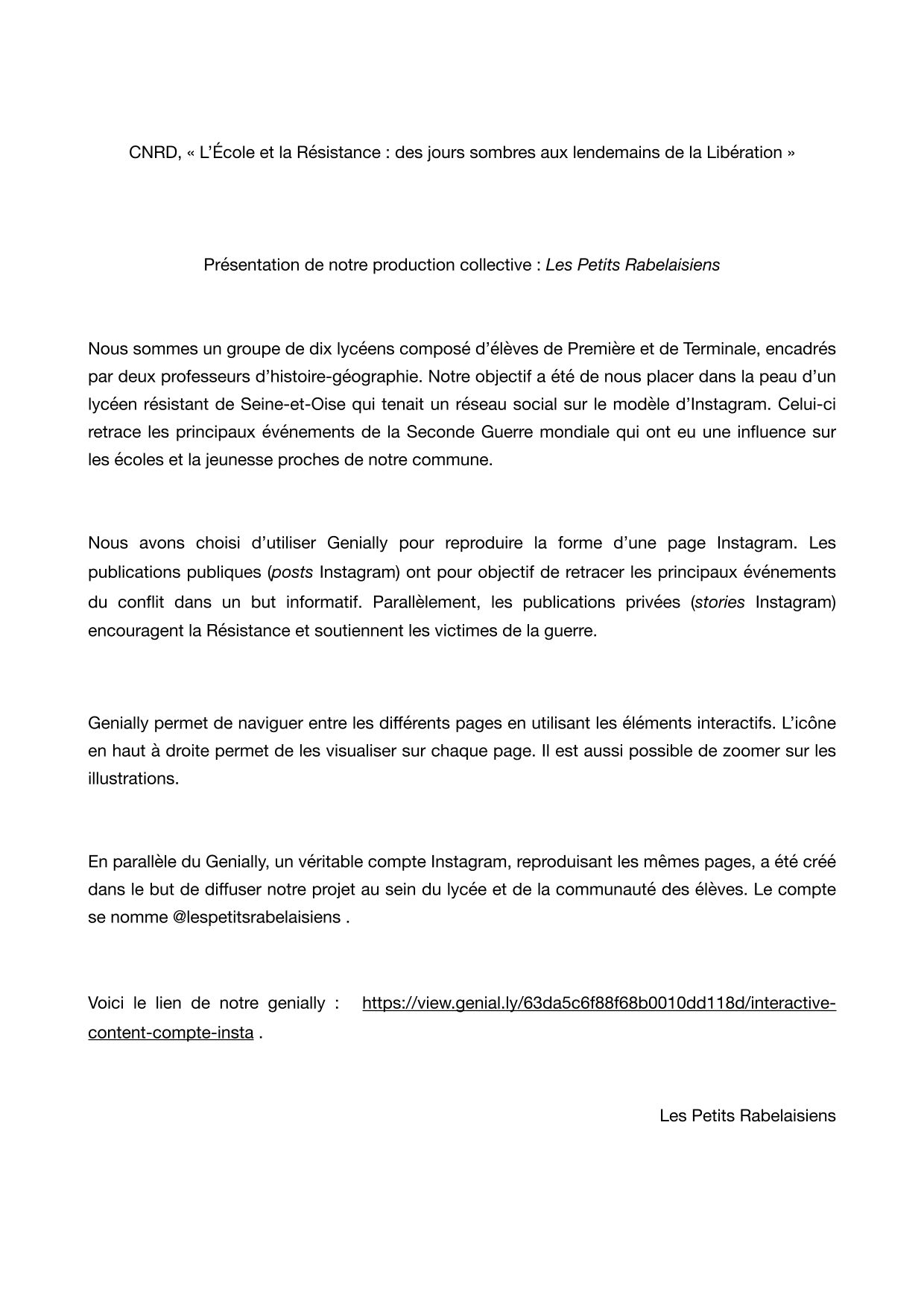 Compte Instagram : " @lespetitsrabelaisiens Suivez l'actualité des jeunes des environs de Houilles pendant la guerre. Restez connectés ! "